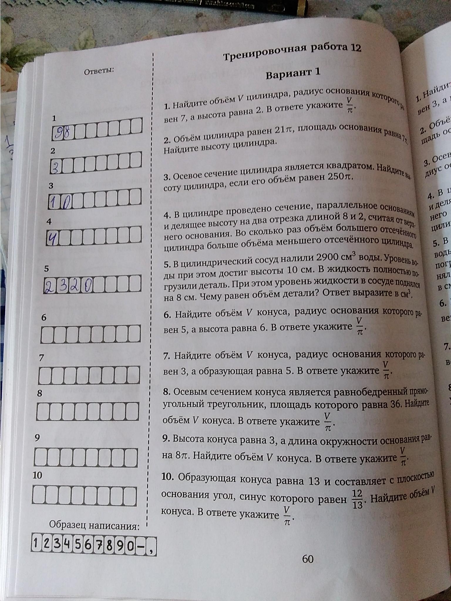с.57 Задача 9 решается так: Пусть образующая конуса - это "х". Далее ты вспоминаешь, что угол 60 градусов, значит можешь найти радиус основания через косинус 60 градусов... И составляешь уравнение. |