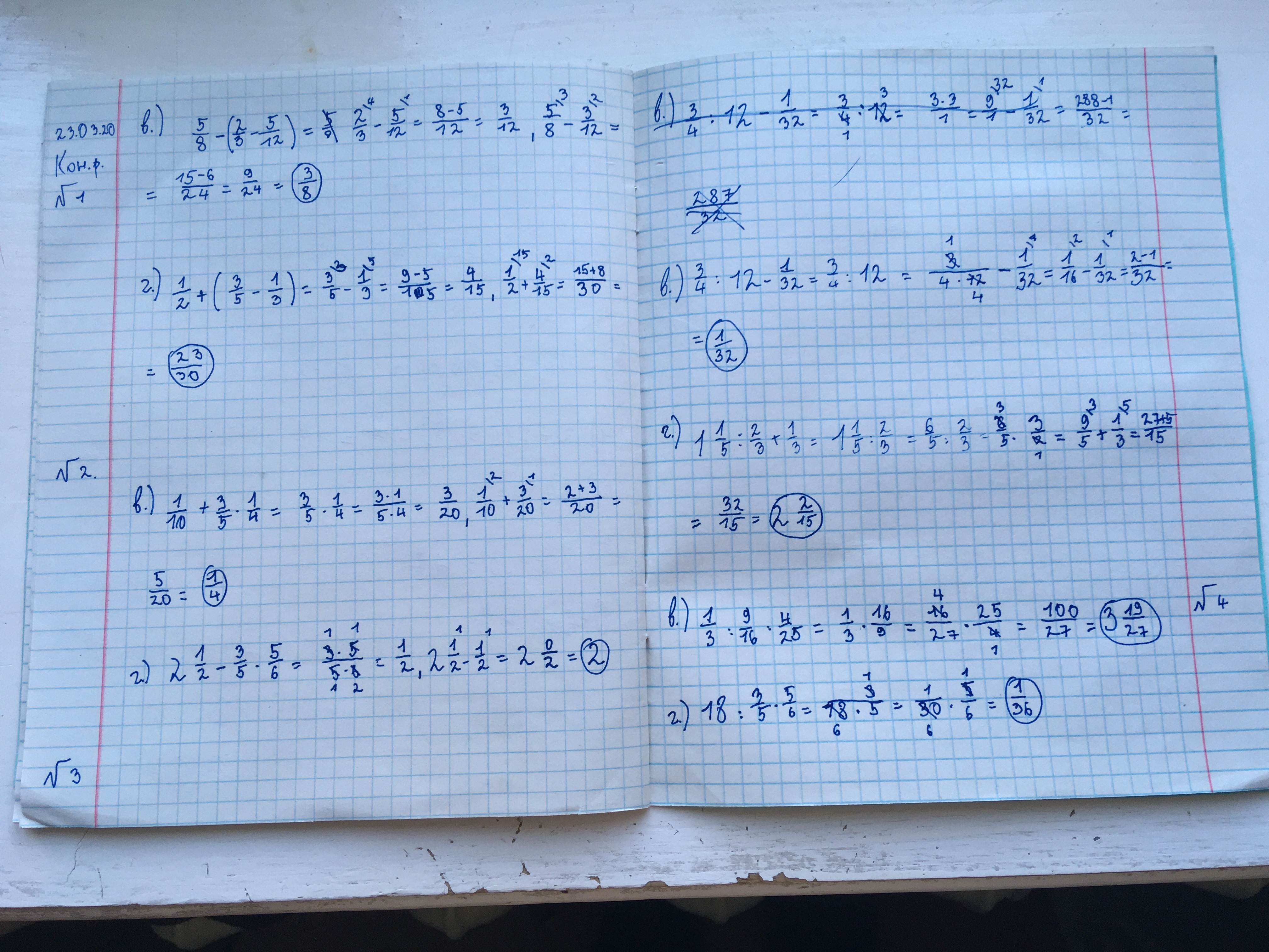 Обращайте внимание детей на то, что дроби надо СОКРАЩАТЬ,при нахождении общего знаменателя обязательно писать ДОПОЛНИТЕЛЬНЫЕ МНОЖИТЕЛИ, НЕПРАВИЛЬНУЮ дробь в ответе переводить в СМЕШАННОЕ число. ОФОРМЛЕНИЕ работы (это способ уменьшить в будущем количество ошибок): писать "буковки" и номера - иначе трудно проверять, между строками пропускать не меньше ДВУХ клеточек, иначе не разобраться, порядок действия писать в кружке ( у большинства это выглядит, как показатель степени) |