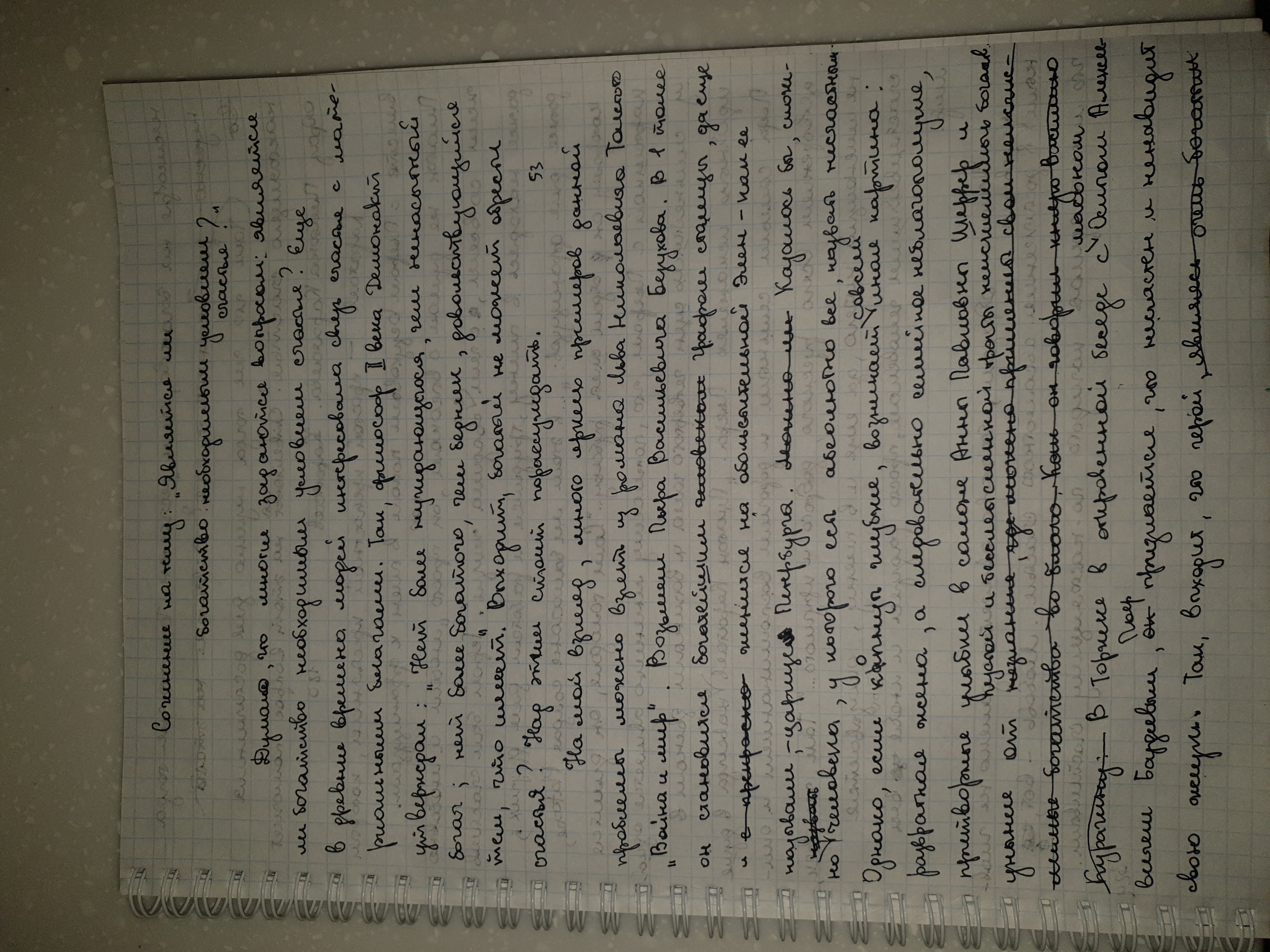 Можно ли быть счастливым, когда вокруг несчастные?Есть ли определение к слову “счастье”? Если смотреть на всех людей в целом, то можно заметить, что радость может исходить от одного человека и все вокруг, на данный момент, счастливы. Каждый человек по-разному это воспринимает. Счастливым быть проще, если душа чиста. Мир – это счастье? Если в душе мир, то, наверно, да. Однако вражда героев в мирное время может привести к войне. В романе “Война и мир” автор подробно пишет о внутренних изменениях главных героев. На протяжении всего романа, проходя через множество испытаний, они находят своё призвание, своё счастье. Но неужели герои становятся счастливыми только тогда, когда находят себя? В начале романа Пьера Безухова не были несчастным, однако то счастье, которое он испытывал, было не настоящим. Светские лица, например, как Анна Павловна Шерер считает, что: “иногда несправедливо распределяется счастье жизни”. Для неё счастье – это что-то материальное, а не духовное. Такие герои не видят истинны. Находясь в их окружении, легко поддаться страстям. Например, Наташа Ростова не сдержала своё обещание, данное Андрею Болконскому. В эпизоде, где Элен Курагина общается с Пьером Безуховым, перед признанием в любви, есть внутренний монолог, в котором Пьер говорит: “что-то гадкое есть в том чувстве” – герой уже осознаёт, что поступает не по совести, однако ему не хватает смелости. Попущенные испытания дают возможность стать сильным и самостоятельным. Всё в жизни происходит неслучайно. Пьер обрёл спокойствие, когда потерял возможность выбирать то, что хочется, когда лишился всего, что было совершенным счастьем, а выбор занятия, теперь, когда выбор этот был так ограничен, казались ему таким легким делом. Тогда получается, что счастье – это чувство к чему-то новому или обретение того в чём нуждался? Во внутреннем монологе Пётр Безухов вспоминает слова князя Андрея: “счастье бывает только отрицательное, но он говорил это с оттенком горечи и иронии”. Андрей Болконский не имел в виду, что на свете нет счастья. Он считал, что избыток удобств жизни уничтожает все счастье. Князь Андрей нашёл спокойствие в ясном небе. “Совсем не так ползут облака по этому высокому бесконечному небу «…» и как я счастлив, что узнал его наконец. Да! Всё пустое, всё обман…”. Л.Н. Толстой ценит естественность в героях. По возвращению домой Николай Ростов осознал: “-всё это, и несчастье, и деньги, и Долохов, и злоба, и честь,- всё это вздор… а вот оно - настоящее”. Николай заметил счастье в глазах сестры Наташи и Сони. Всё неестественное перестало для него иметь какое-то значение. Можно быть счастливым, когда вокруг счастливые. Однако герои по-разному воспринимают счастье. После долгих исканий, Пьер обрёл понимание жизни и стал ценить то, что ему дано. Толстой считает, что: “можно зарезать, украсть и всё-таки быть счастливым”. Счастлив тот, кто живёт не для себя. |
