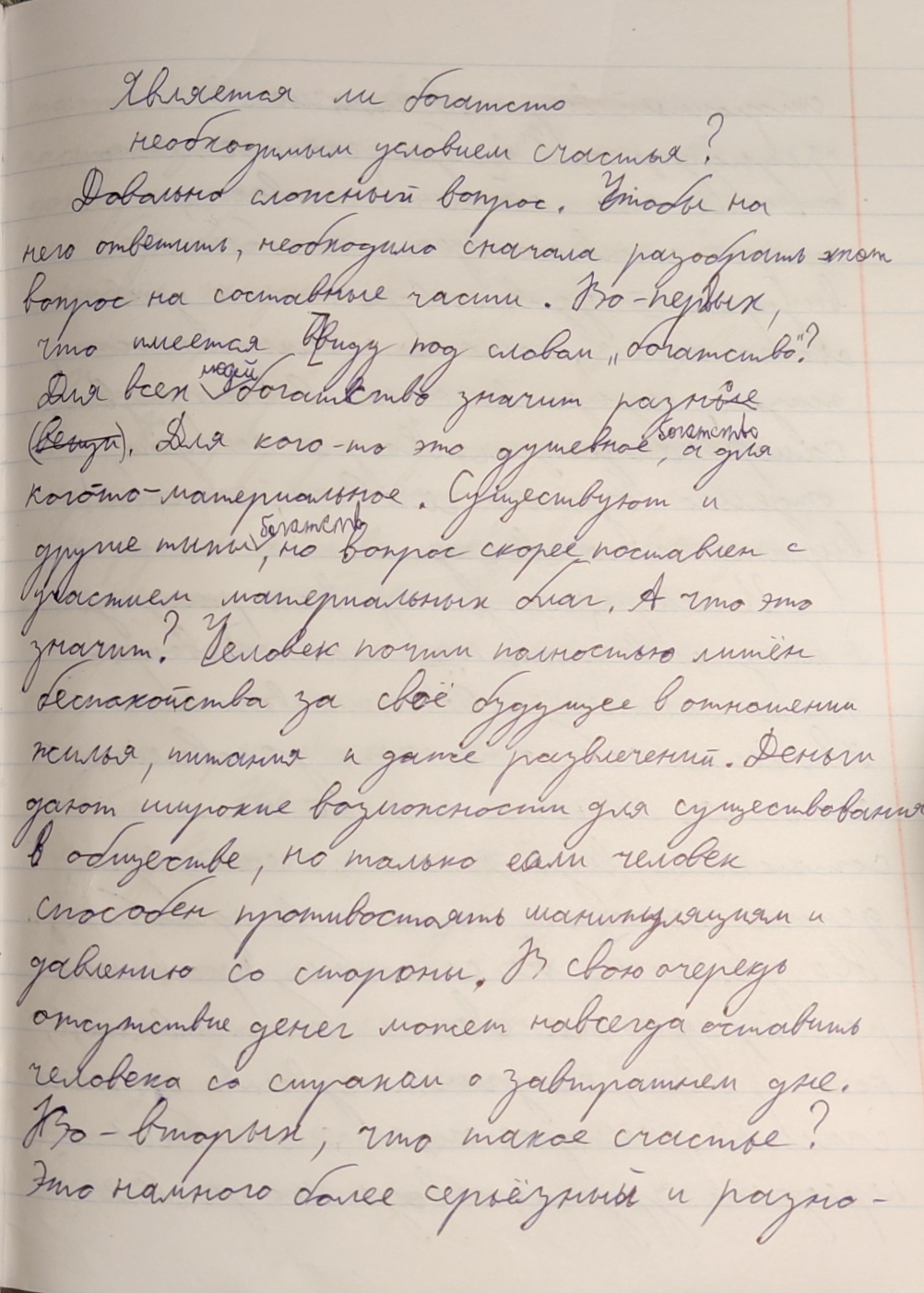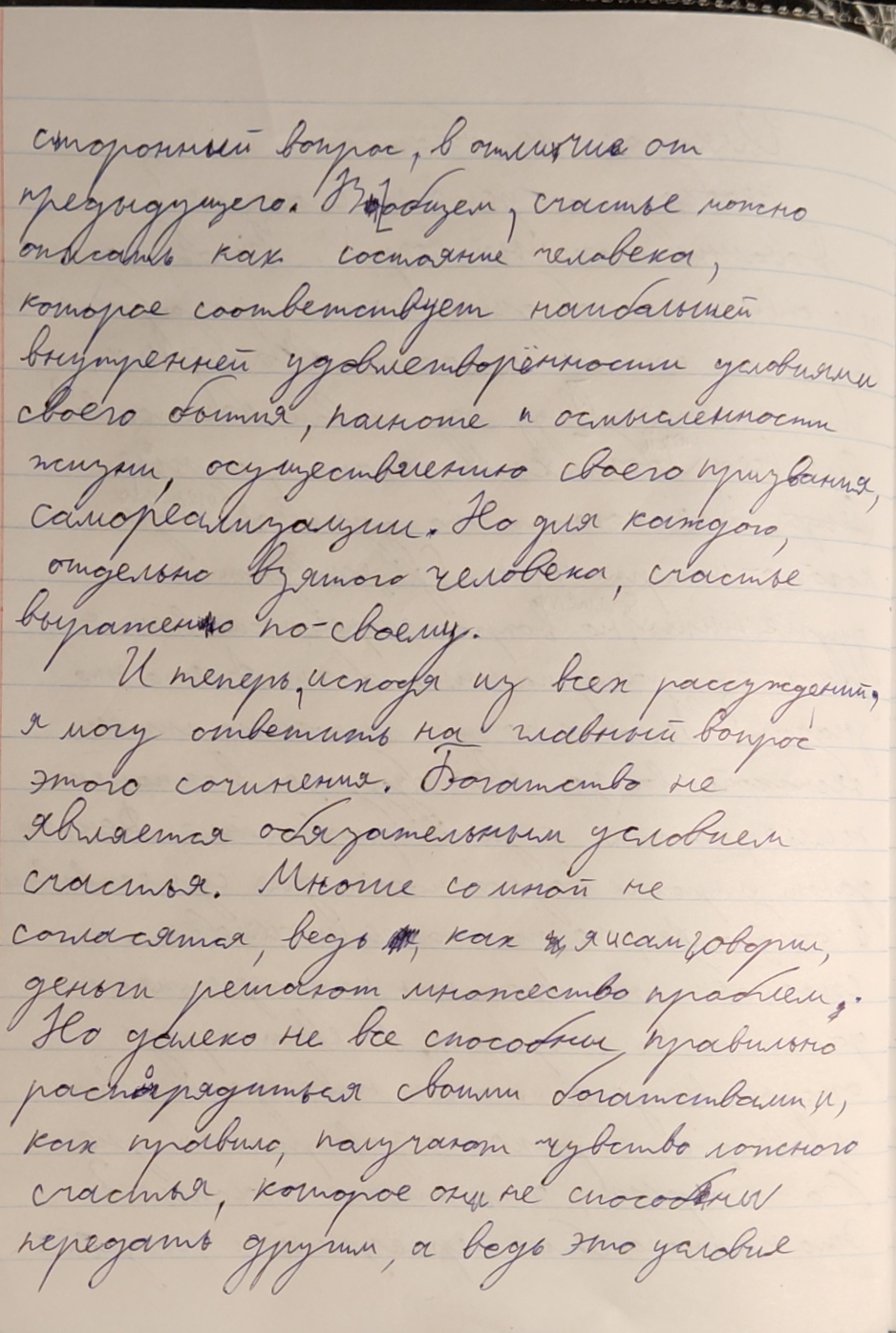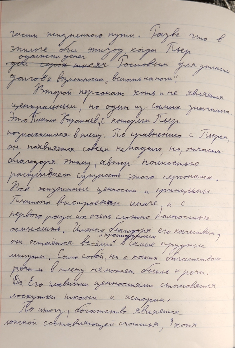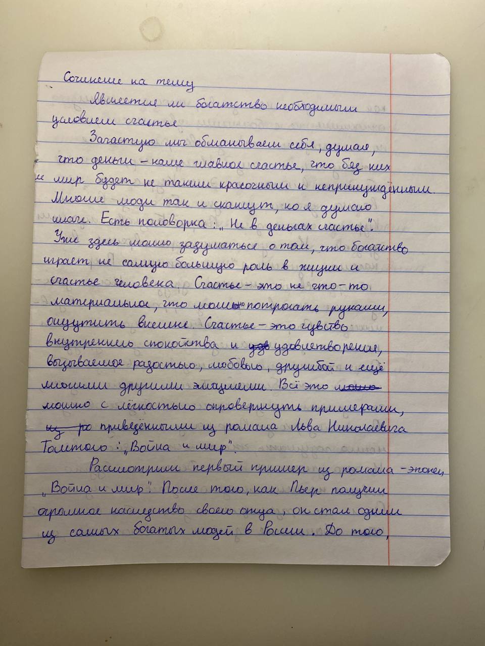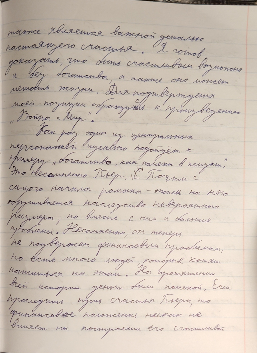 503 ЯВЛЯЕТСЯ ЛИ БОГАТСТВО НЕОБХОДИМ УСЛОВИЕМ ДЛЯ СЧАСТЬЯ? Многие думают, что богатство является необходимым условием для счастья, но я так не считаю. Счастье прямо не связано с материальным благом. Его существование зависит не от земных и плотских ценностях, а от духовных и нравственных. Счастье - это про чувства. Богатство может поспособствовать счастью, но не является его необходимыми условием. Как человек распорядиться им, от этого и будет зависеть его счастье. Это можно доказать примерами из романа-эпопеи Льва Николаевича Толстого "Война и Мир". Первого в пример хочу привести центрального персонажа Пьера Безухова. В начале романа он получил огромное наследство, женился на красивой женщины и все к нему относились с почтением. Казалось бы, что ещё надо для счастья. Но был ли Пьер счастлив? Нет. В его внутренних монологах и диалогах с Андреем Болконским это отчётливо видно. Пьер ищет счастье первые три тома романа. Он даже вступает в масонство, чтобы получить удовлетворение и спокойствие, но не находит его там. Поженившись на Наташе, он обрёл счастье. Замечу, что Наташа была бедной девушкой и невыгодной партией для Пьера. Но с начала из знакомства Ростова освещала душу Безухова теплом и любовью. Этот пример показал, что Пьера сделало счастливым не деньги, которые у него были в избытке, а добрые и нежные чувства. Второй пример для доказательства моего суждения- это героиня Наташа. В начале романа она жила в довольно обеспеченной семье и была радостной и счастливой девушкой. Она поражала всех вокруг своей простотой и делилась с другими своим счастьем и любовью. Потом их семья разарилась, но Наташа Ростова стала несчастной не из-за этого, а из-за проблемы в её отношениях с Андреем. Когда она вышла из депресивного состояния, она помогала раненым и своей семье. И на её улучшение не повлияли деньги. Она наоборот отказалась от приданого ради спасения людей.Это показывает, что счастье героини зависит не размеров её состояния, а из-за её внутренних чувств. Два этих примера показали, что счастье приносят не деньги, а добрые нежные чувства людей. Наташе не помешало быть счастливой отсутствие денег, а Пьеру они не принесли счастья. Безусловно правильное управление деньгами может принести счастье, но это не будет являться его необходимым условием. Добрые люди, искренние отношения и нежные чувства помогли героям обрести счастье. |